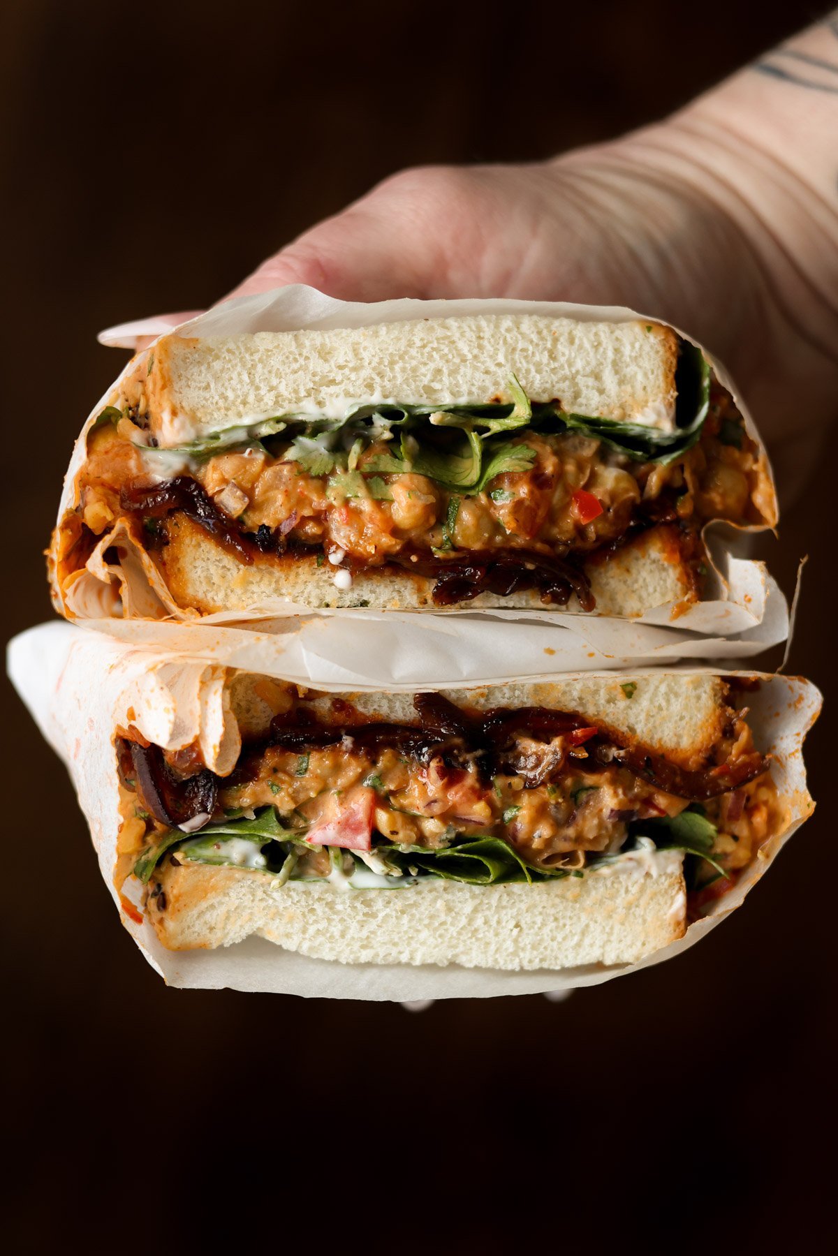 A creamy, spicy gochujang chickpea salad sandwich with spicy-sweet gochujang caramelized onions is a Korean-style twist on this lunchtime favorite! It’s hearty, satisfying, and packed with FLAVOR! Options for gluten-free Soyfree and nutfree.