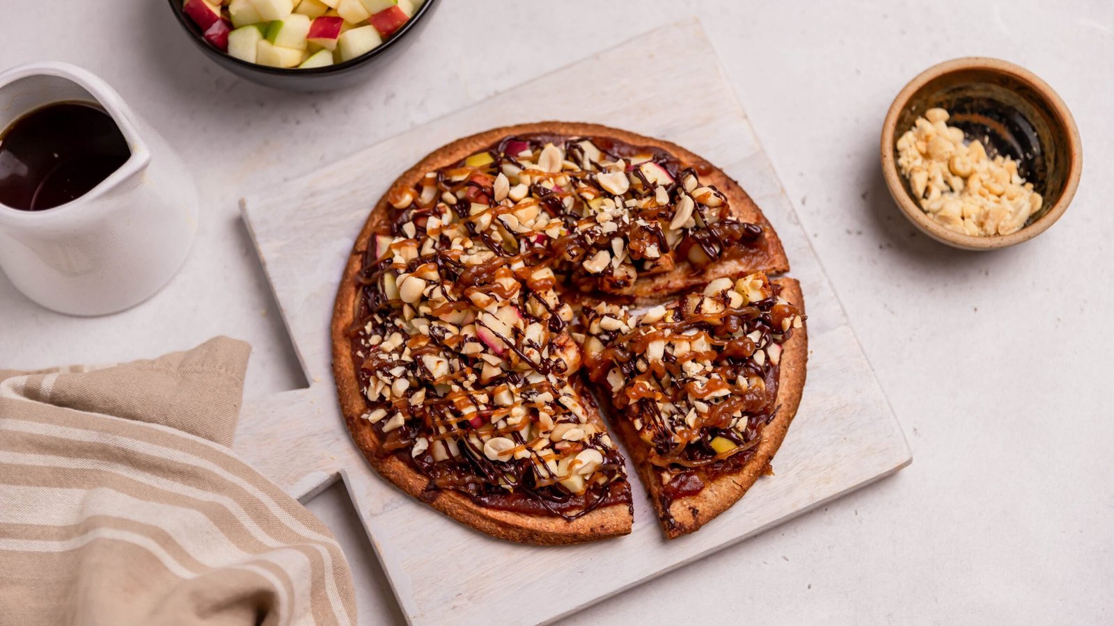 Homemade date caramel, crunchy apples, melted chocolate, and chopped peanuts come together deliciously in this PLANTSTRONG-approved Date Caramel Apple Pizza. The perfect hint of sweet and salty on our new PLANTSTRONG personal pizza crust!