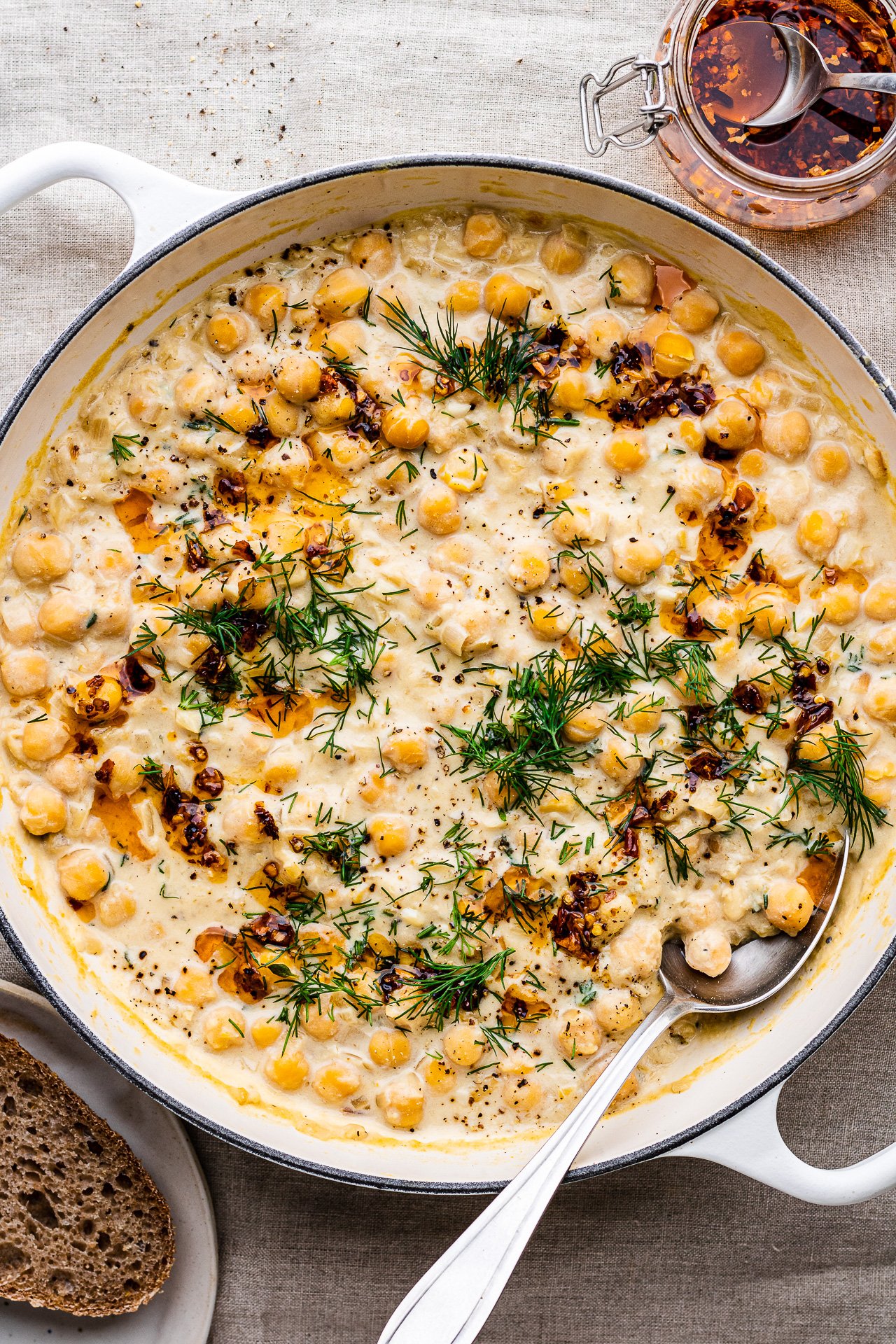 6. Divide between bowls, sprinkle with fresh dill and drizzle with chilli oil. Serve alongside toasted sourdough. I sometimes also like to serve it with pan-fried vegan sausages for more bulk/protein.